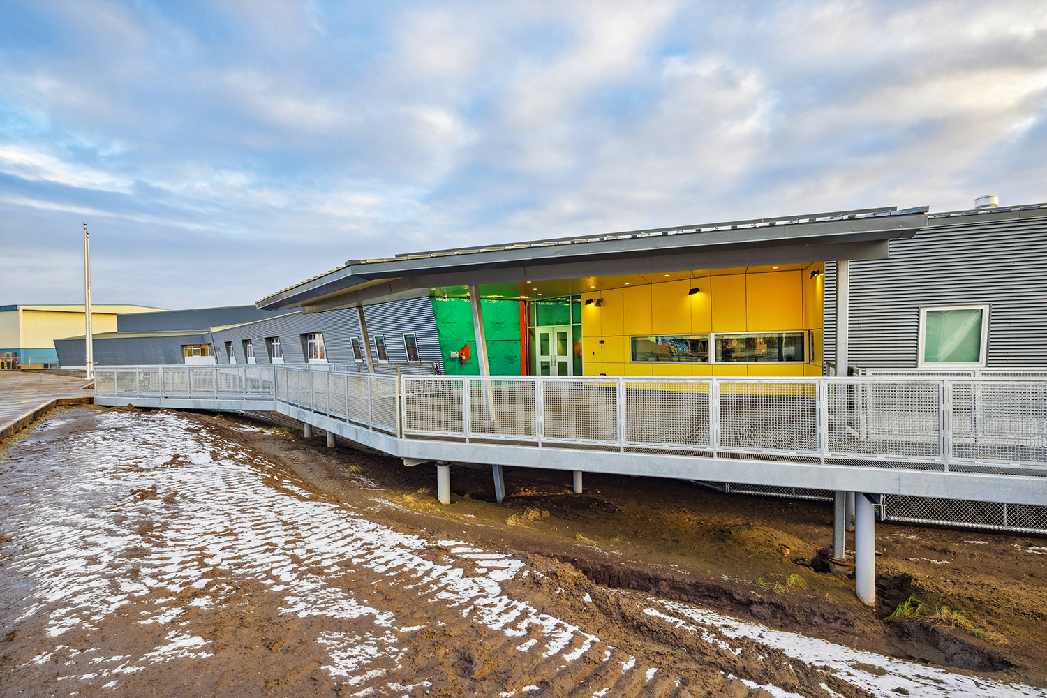 UNIT COMPANY and Bethel Federal Services have once again joined forces to construct the new school in Bethel, Alaska. The new school replaces the original school that burnt down in 2015. The project consists of the construction of a new 53,865 SF (including storage mezzanine and mechanical platform) school for grades Kindergarten through 6. Features include classrooms, gymnasium and Language and Cultural Center offices. Other features include a parking lot, fire access road, site utilities and infrastructure and public access roads. Site utilities and infrastructure include an electrical module, generator module with associated fuel tank, installation of owner provided IT module, building utilities, boardwalks, play deck, play court, relocated basketball hoops and play equipment, provision and installation of new play equipment, landscaping, pedestrian boardwalks, pedestrian crossing over adjacent site utilidors (the utilidor hung below an occupied building), retaining walls, crosswalk lighting reconnection and replacement stairs to Lower Kuskokwim School District Building.